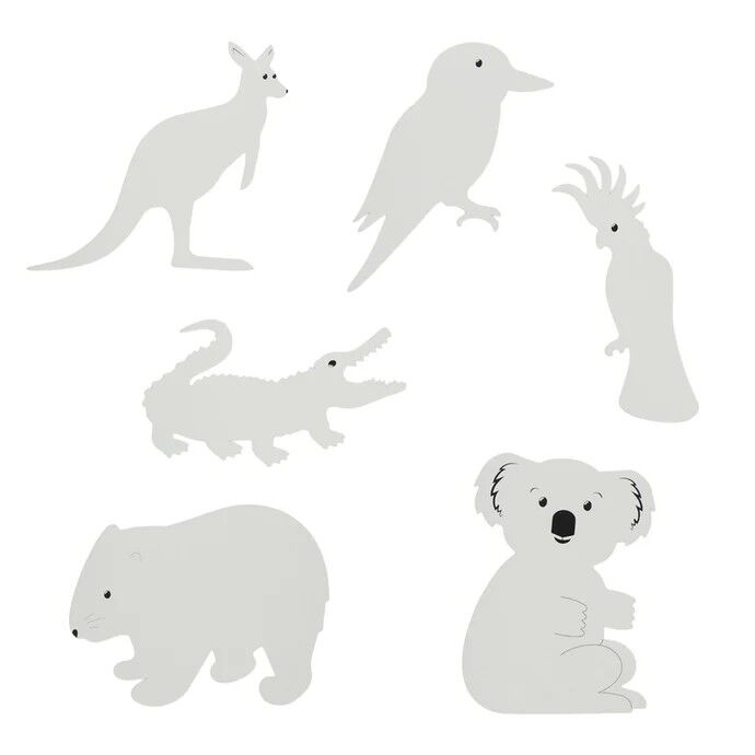 - 6 designs x 3 of each: Cockatoo, Kangaroo, Kookaburra, Koala, Wombat and Crocodile