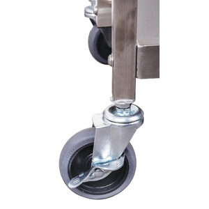 - The trolley is equipped with four TPR swivel castors (100mm diameter), two with brakes, allowing smooth manoeuvrability and secure positioning in busy learning environments