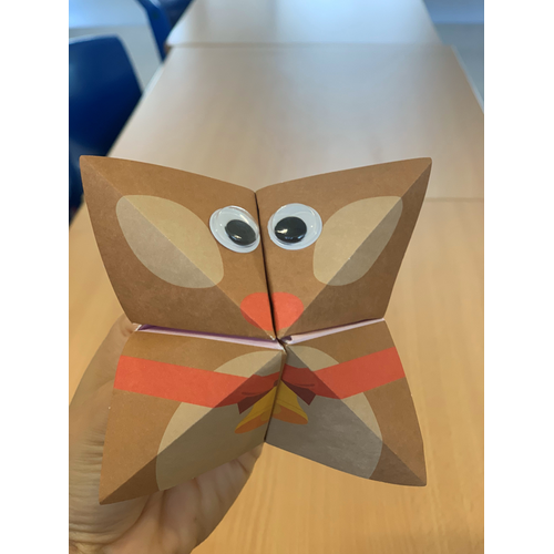 Easy to make with this Chatter box kit by folding the square piece of paper, folding the corners towards the centre, flipping it over and folding the corners again, then folding it in half.