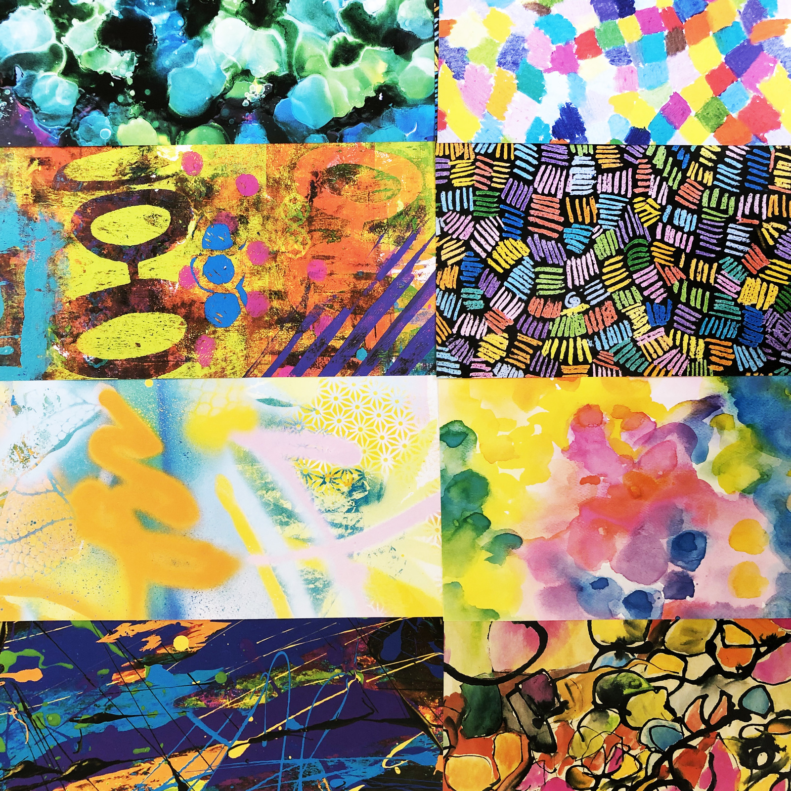 A wonderful and bright selection of ‘arty’ patterns – including oil pastel, watercolour, crayon, inks, alcohol ink, monoprint, spray paint and painted designs.